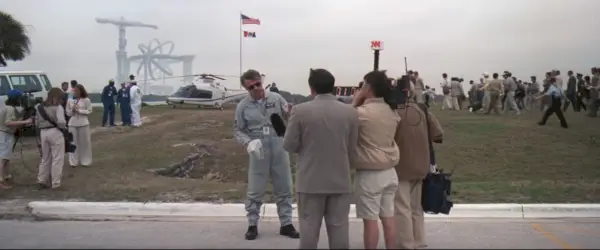 I skuggan av Vehicle Assembly Building ligger NASA Press Site. Området används av rymdreportrar och journalister från hela världen för att rapportera om de viktigaste uppdragen vid Kennedy Space Center. I filmen liknar den mediala frenesi som ockuperar pressplatsen inte något som setts sedan rymdfärjans pensionering 2011. Idag är det inte i närheten av mängden media som setts i filmen eller under glansdagarna. Apollo och skytteln. Startrackern är en av få medier på plats regelbundet.