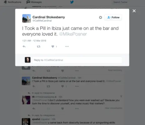 Jag vet att skrivandet av den här bloggen inte kommer att påverka fenomenet att människor missförstår I Took a Pill in Ibiza. Men gissa vad? Det är O.K. Folk är upptagna och har sina egna jobb, de är inte skyldiga att dissekera texterna till min musik. De har andra saker att göra. Om de vill festa och göra allt jag säger gjorde mig sorgsen i min låt, med min låt som soundtrack... så var det. Då kanske de kan få igång lite ironier i sitt liv som jag har i mitt. När blev Gud eller vilken gudomlighet som orkestrerade mitt liv och karriär en sådan skojare?