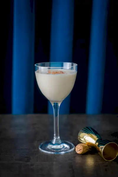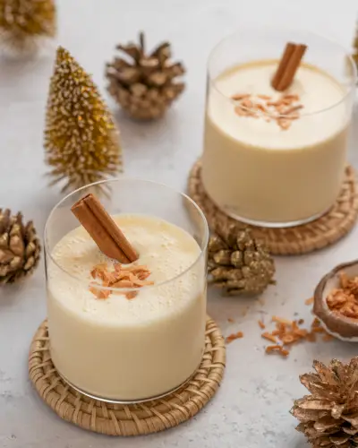 Tillsätt rom och äggnog i en cocktailshaker fylld med is; skaka för att kombinera och kyla. Sila ner i ett stenglas utan is. Garnera med rostade kokosflingor och en kanelstång.