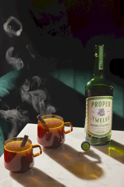Över värme, kombinera rätt nr. tolv irländska äpplen, äppelcider, kanelstänger, muskotnöt, kryddnejlika och apelsinskal i pannan. Häll upp i en värmeskyddad mugg. Garnera med apelsin twist.