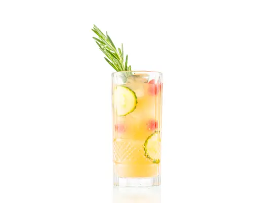 Kombinera alla ingredienser, förutom det mousserande vinet, i en cocktailshaker med is; skaka väl. Sila upp i ett stenglas över färsk is och toppa med mousserande vin. Garnera med rosmarinkvistar, gurka och tranbär.