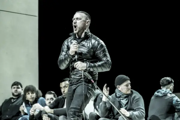 En traditionell iscensättning av Edmond Rostands Cyrano de Bergerac (1897) skulle normalt fyllas av vapen: svärd på varje fransmans höft, sedan gevär och dödliga kanoner när de marscherar för att stöta bort spanska inkräktare i Arras. Den nuvarande, moderna versionen på BAM saknar farlig hårdvara – om du inte räknar med mikrofonerna som karaktärer griper och spottar rim in i. Snyggt minimal, med maximal känslomässig punch, regissören Jamie Lloyd’s Cyrano är ett vapenlöst språkunderverk. För det, som jag skriver dagar efter tio personer sköts på tunnelbanan i Sunset Park är jag extra tacksam.