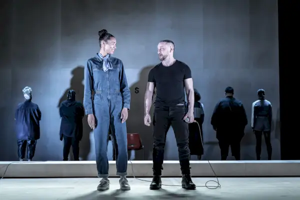 Lloyds iscensättningsteknik liknar replokalsestetiken hos hans mindre framgångsrika Svek : skådespelare i mörka gatuklädsel, på en aggressivt bar scen, kall, föga smickrande ljussättning och en benägenhet att vända sig framåt och deadpan. Förplattningen av det teatrala (och känslomässiga) rummet är ännu mer uttalat hos BAM. Under de första tio minuterna sitter skådespelare på huk på ett lågt, vitt riser och levererar sina repliker rakt ut i rat-a-tat-rytmer, en nästan bedövande monotoni som bryts när McAvoy (som har suttit uppe på scenen och stirrat in i en spegel) hamnar i centrum. upprörd över en schlockig skådespelares mauling av Liten by . Från den punkten släpper spänningen knappt.