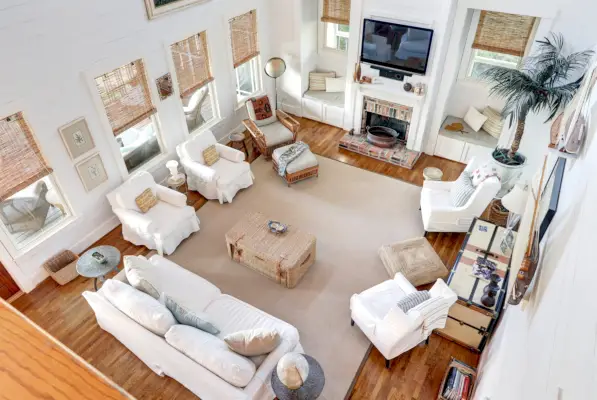 Det avskilda huvudhuset med fyra sovrum och tre badrum sträcker sig över 3 360 kvadratfot och har katedral och trägolv överallt. Det öppna stora rummet består av en matplats och ett vardagsrum med en öppen spis i tegel och inbyggda fönsterplatser. Köket med matplats är utrustat med vitvaror från Viking och SubZero i rostfritt stål, vita skåp, en vinkylare och en butlers skafferi, förutom sittplatser för frukostbaren.