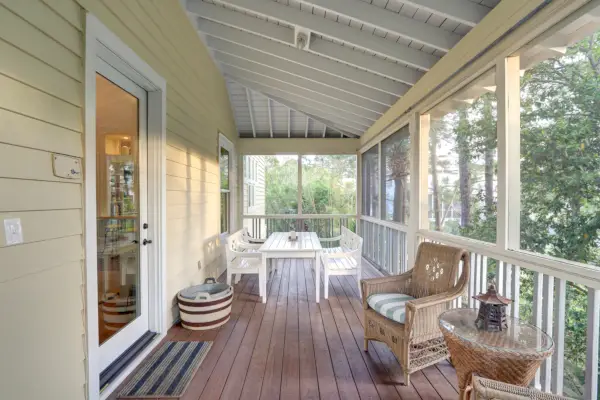 Ägarens svit ligger på bottenvåningen, med vita panelväggar och ett angränsande anslutande rum som kan fungera som en sittgrupp eller omklädningsrum. Badrummet är utrustat med ett badkar, en separat dusch och en privat avskärmad veranda, enligt annonsen som delas av Celia Dunn Sotheby's International Realty mäklare Rachel Umbreit och Ruthie Lynah-Whitlow.
