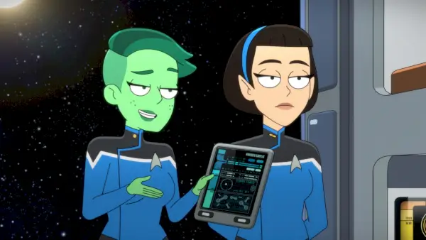 Fänrik Tendi (röst av Noel Wells) och T’Lyn (röst av Gabrielle Ruiz) i avsnitt 1, säsong 4 av Star Trek: Lower Decks. Paramount+