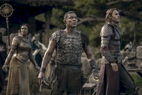 (L till R) Cynthia Addai-Robinson, Ismael Cruz Córdova och Charlie Vickers i Sagan om ringen: Maktens ringar .Matt Grace/Prime Video