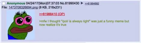 Ta /pol/: Till stor del anses av media vara en bastion för alt-högern, denna uppfattning återspeglas i åsikterna från /pol/ som innehas av användare på 4chans andra anslagstavlor. Utanför /pol/ tenderar 4chans styrelser att vara mer centristiska eller helt opolitiska. På 4chans /tv/ – Television & Film board, till exempel, är en vanlig refräng när någon postar en högerinriktad politisk kommentar till en tråd om ett tv-program att gå tillbaka till /pol/. Men denna dynamik verkar vara på väg att förändras.