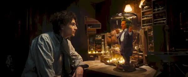 Timothée Chalamet som Willy Wonka och Hugh Grant som Oompa Loompa i Wonka .Med tillstånd av Warner Bros. Pictures